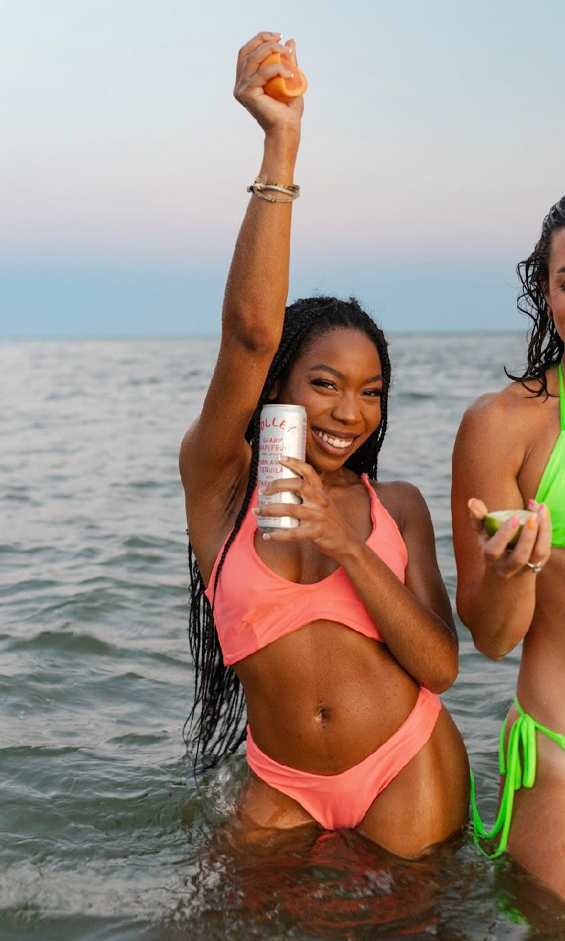The Sharp Grapefruit Top mirrors the Volley Tequila Seltzer flavor, Sharp Grapefruit and features a deep V kinilette top fit that can be worn as either a kini top or sports bra.